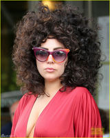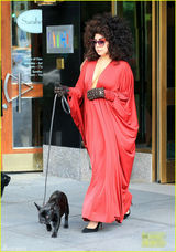 当地时间2014年7月30日,美国纽约,Lady Gaga身穿一件红色深V“浴袍”装牵爱犬出街,此番又是真空上阵并且再次回归爆炸头的她大胆露奶。(2014-07-31 / sina)